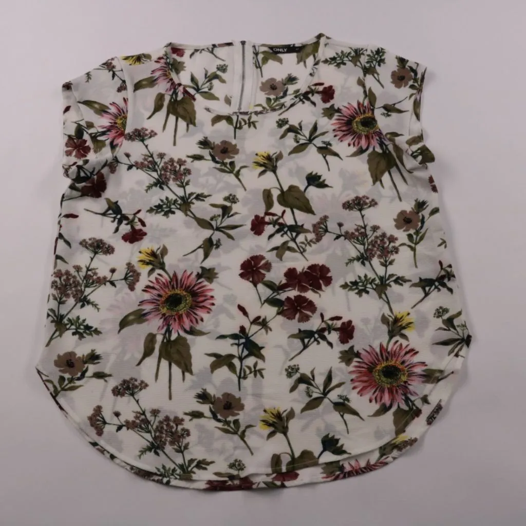 Женский топ ONLY с цветочным принтом на белом фоне, без рукавов и с округлым вырезом. Подойдёт для лета и тёплых дней, легко сочетается с джинсами, юбкой или шортами. Сзади есть молния, что удобно для надевания.