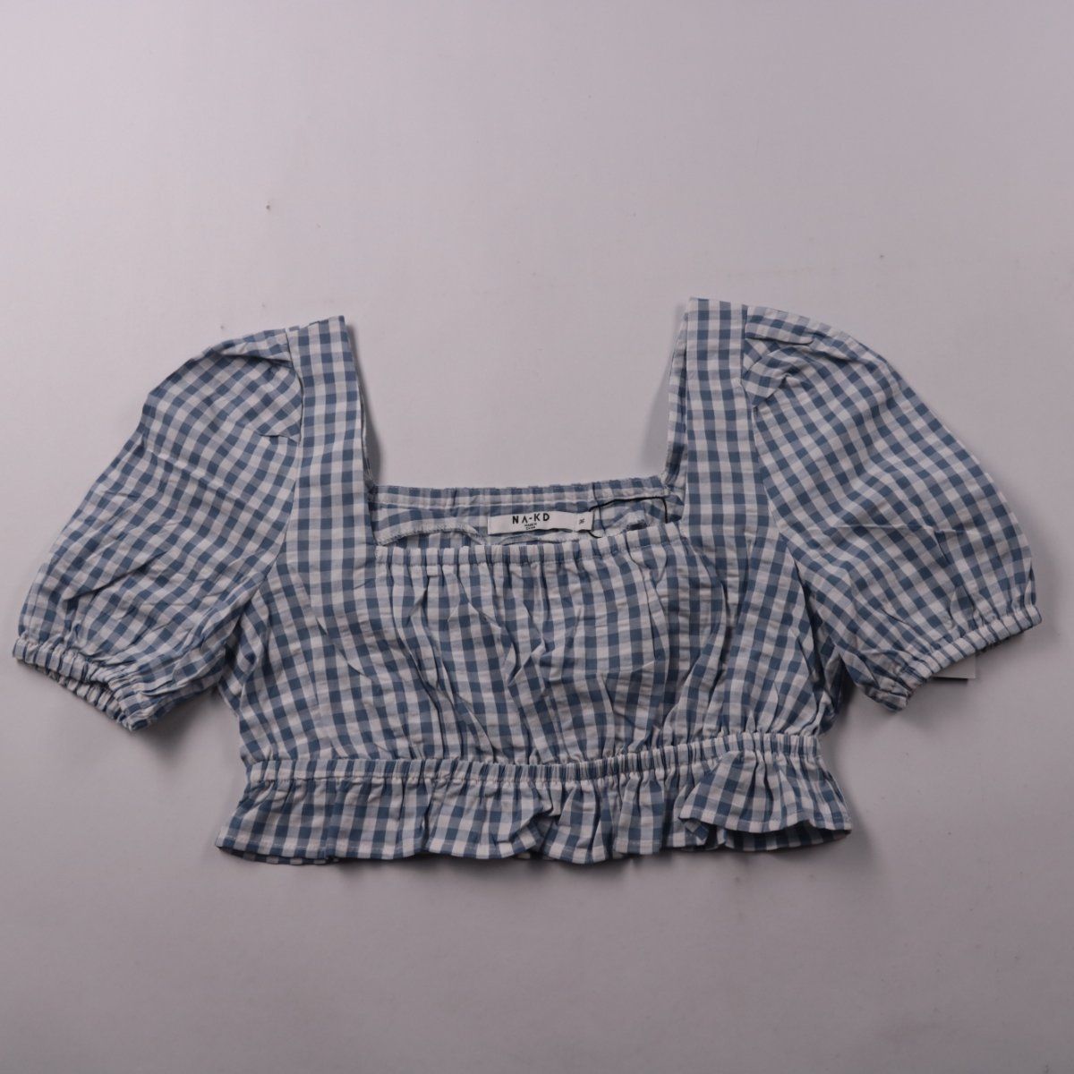 Укороченный топ NA-KD в голубо-белую клетку с квадратным вырезом и объёмными рукавами на резинке. Подойдёт для летних прогулок и образов с джинсами или юбкой с высокой посадкой. Хлопковая ткань хорошо пропускает воздух и комфортна в жару.