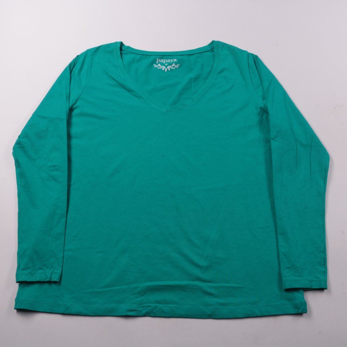 Женский лонгслив Papaya зелёного (бирюзового) цвета с V-образным вырезом. Подойдёт для повседневной носки и как базовый слой в прохладную погоду. Трикотаж с добавлением эластана тянется и комфортно садится по фигуре.