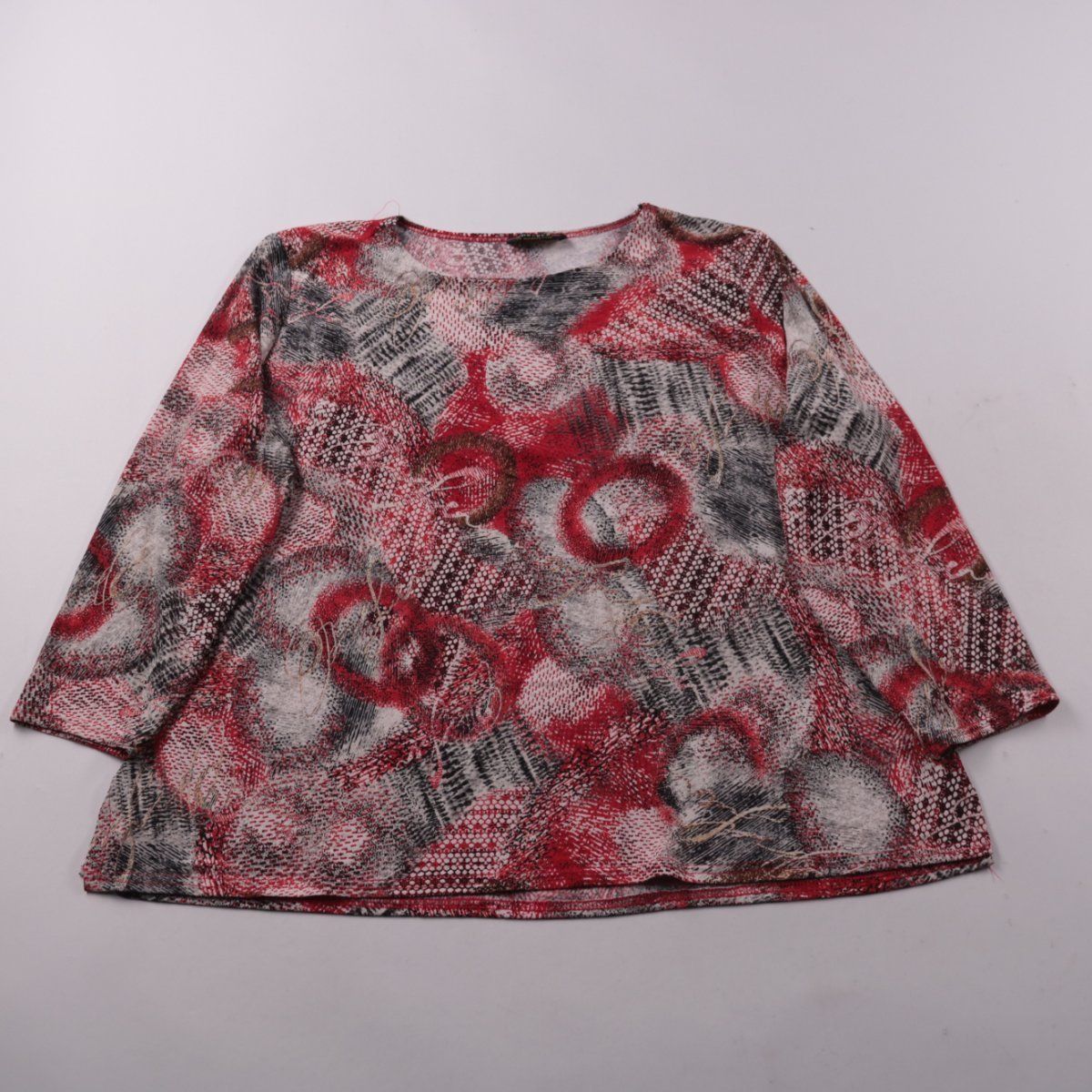 Женский лонгслив Forever by Michael Gold с абстрактным принтом в красно-серо-чёрной гамме и круглым вырезом. Подойдёт для повседневных образов и как базовый слой под жакет или кардиган. Ткань с эластаном слегка тянется и комфортно садится по фигуре.