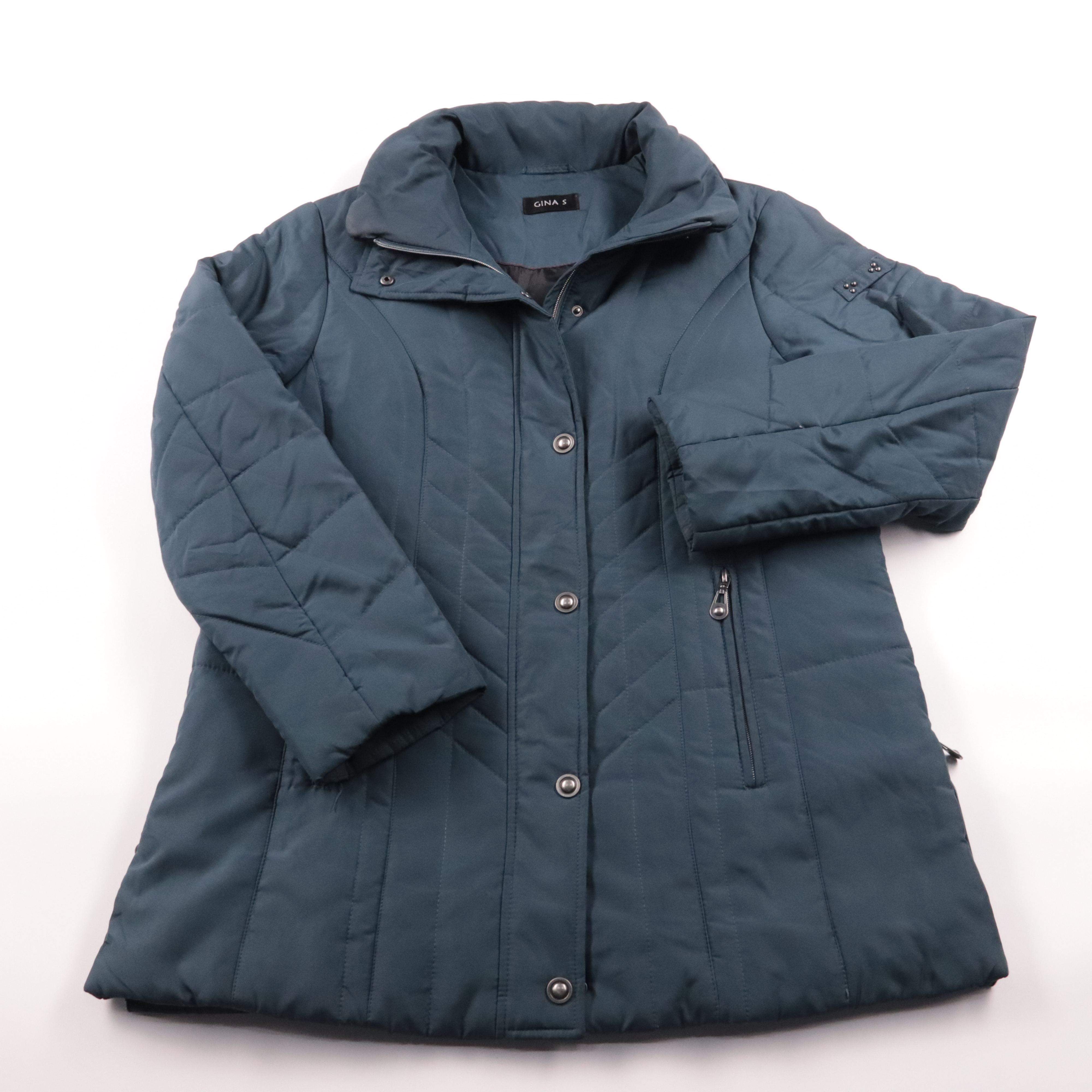Демисезонная стёганая куртка Gina S в сине-зелёном оттенке, приталенного силуэта и с высоким воротником-стойкой. Подойдёт для прохладной весны и осени, хорошо сочетается с джинсами и повседневной обувью. Практичные боковые карманы на молнии и удобная з...