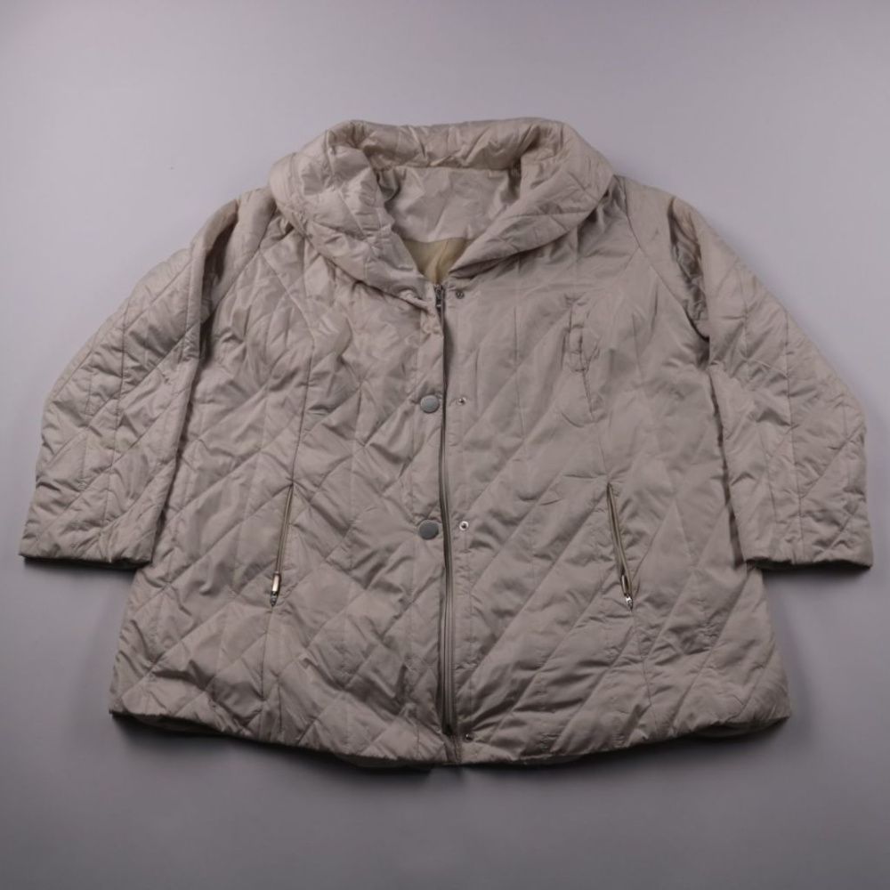Стёганая демисезонная куртка с капюшоном, бренд не указан. Подойдёт для прохладной погоды и повседневных прогулок, есть боковые карманы на молнии. Практичный светлый бежево-серый цвет и удобная застёжка на молнию и кнопки.