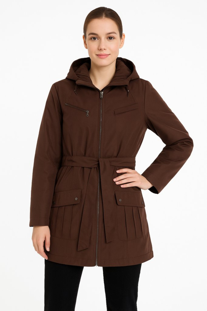 Демисезонная куртка Au Fond A Droute в коричневом цвете, удлинённая и с капюшоном. Подойдёт для прохладной весны/осени, а пояс на талии помогает регулировать посадку. Практичный плюс — удобные карманы и застёжка на молнию.