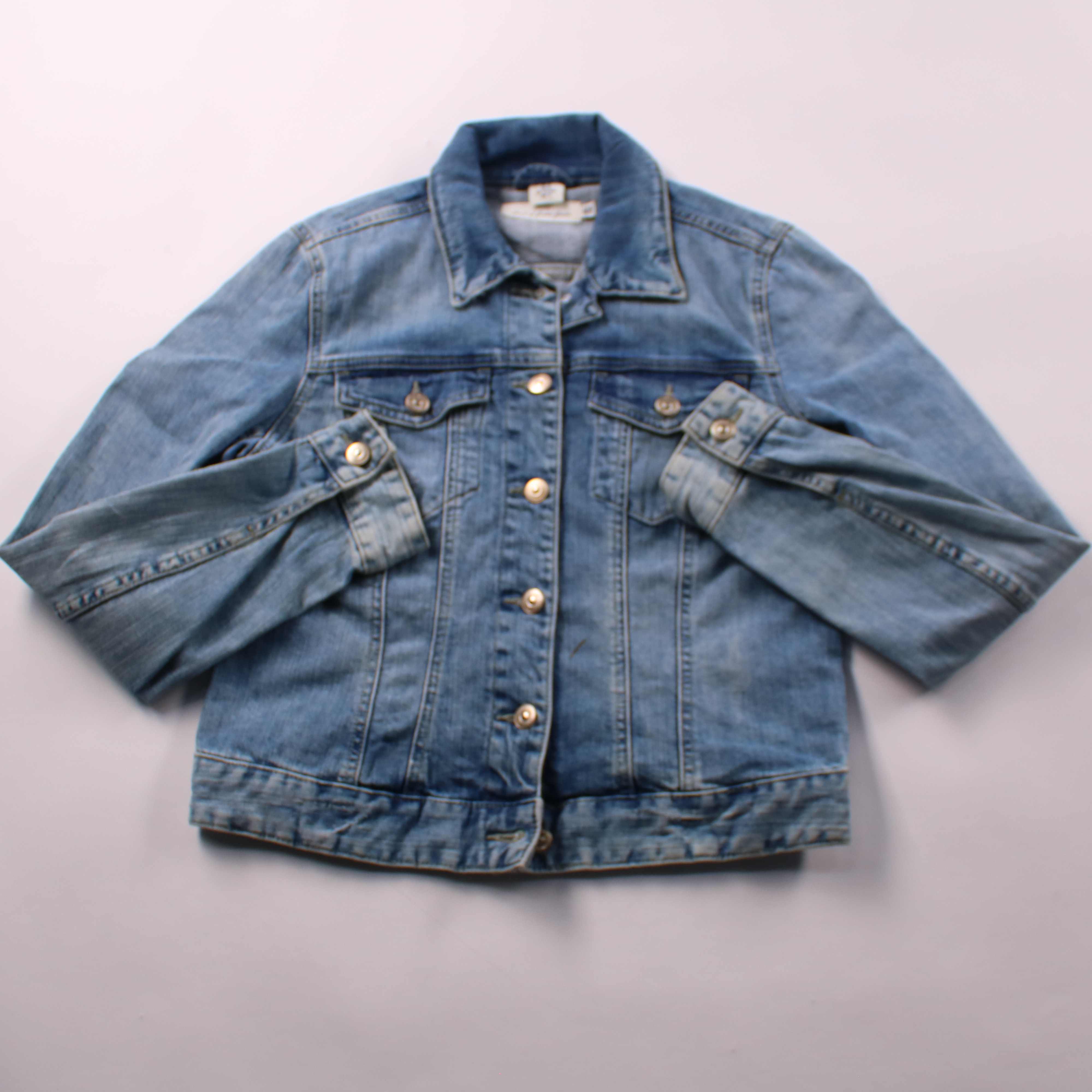 Женская джинсовая куртка H&M из голубого денима на пуговицах, с классическим отложным воротником и нагрудными карманами. Подойдёт для повседневных образов в тёплую весну/осень и прохладные летние вечера. Плотная ткань держит форму и хорошо сочетается с...