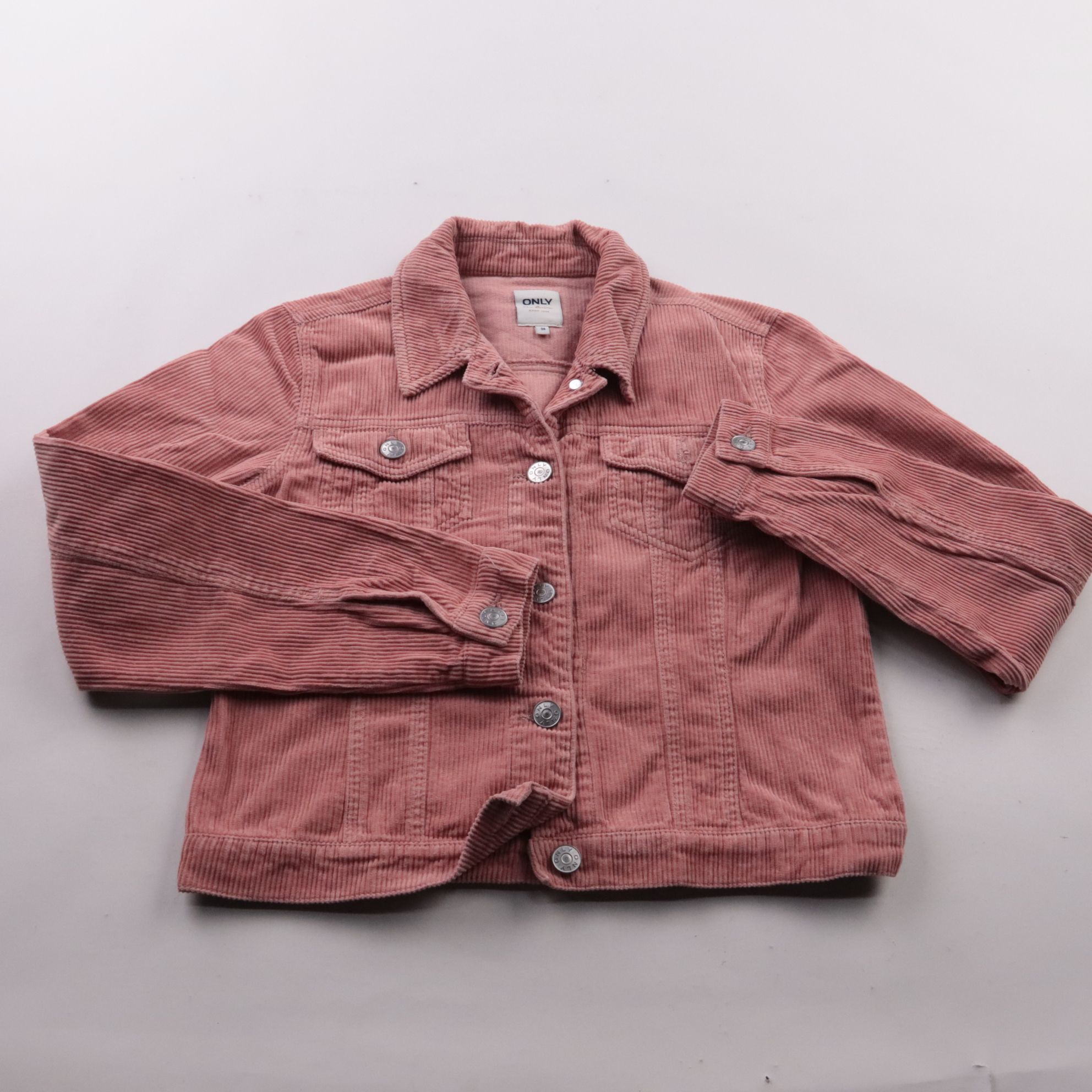 Вельветовая куртка Only в пыльно-розовом цвете, укороченная, на металлических пуговицах и с нагрудными карманами. Подойдёт для прохладной весны и осени, хорошо смотрится с джинсами и платьями. Плотный хлопковый вельвет держит форму и комфортен в носке.