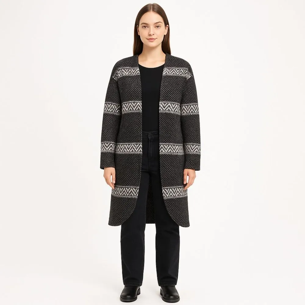 Женское пальто H&M L.O.G.G. из плотного фактурного трикотажа с графичным полосатым узором в серо-чёрной гамме. Подойдёт для повседневных образов в демисезон, удобно носить как на футболку, так и на свитер. Практичный плюс — немаркий цвет и материал, ко...