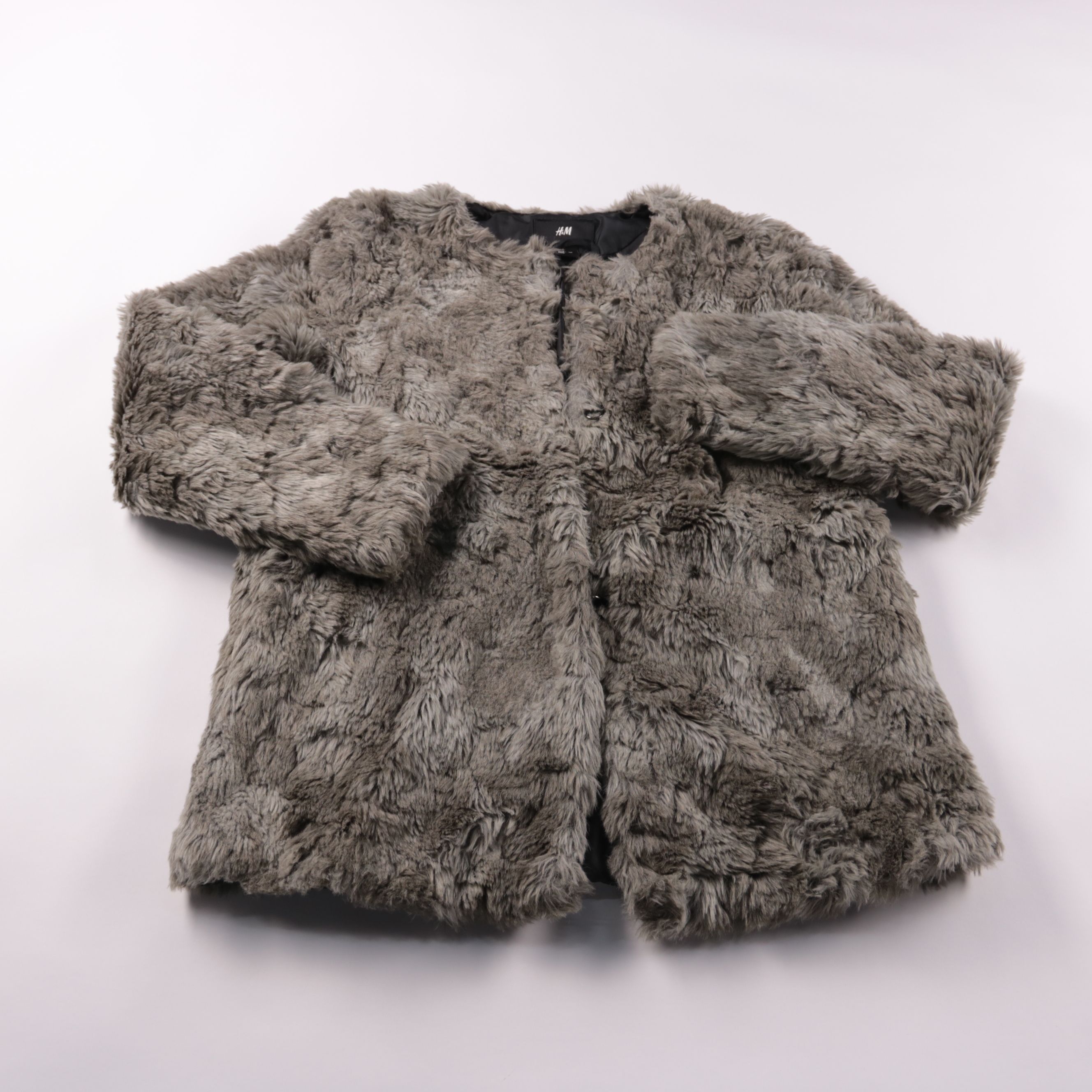 Женская шуба из искусственного меха H&M серого цвета, укороченная модель на застёжке спереди. Подойдёт для повседневных образов в холодную погоду и хорошо сочетается с джинсами и платьями. Практичный плюс — лёгкая в уходе подкладка из полиэстера.
