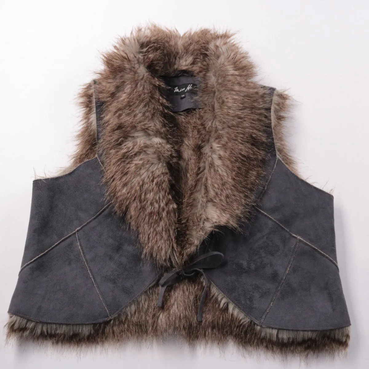 Женский жилет Miss H. с объёмной меховой отделкой и завязками спереди. Хорошо подойдёт для прохладной осени или весны поверх свитера и для многослойных образов. Практичное преимущество — тёплый меховой воротник защищает шею от ветра.