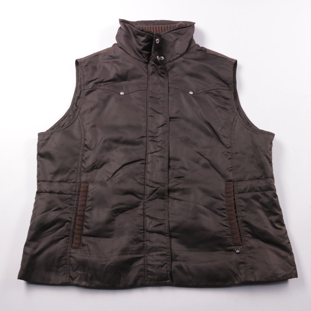 Утеплённый женский жилет Greystone тёмно-коричневого цвета с высокой стойкой и застёжкой на кнопки. Подойдёт для прохладной погоды и многослойных образов, удобно носить поверх свитера или худи. Лёгкий и практичный: не стесняет движения и хорошо сохраняет тепло.