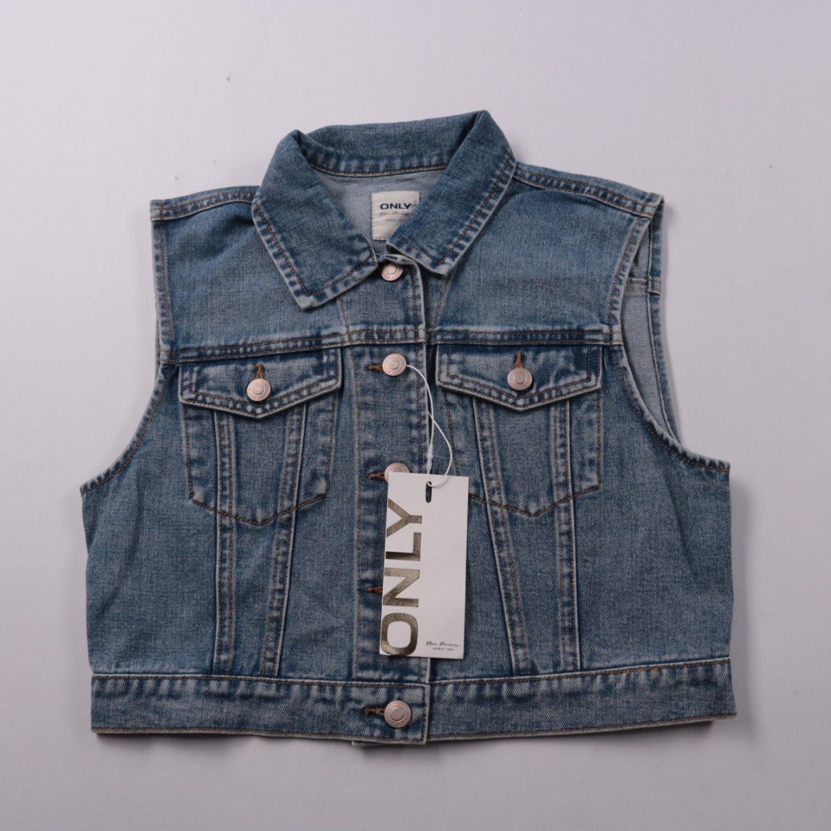 Джинсовый жилет Only из денима среднего синего оттенка, с отложным воротником, нагрудными карманами и застёжкой на кнопки. Подойдёт для многослойных образов с футболками, лонгсливами и платьями в тёплый сезон и в межсезонье. Плотная ткань хорошо держит форму и удобна в носке.