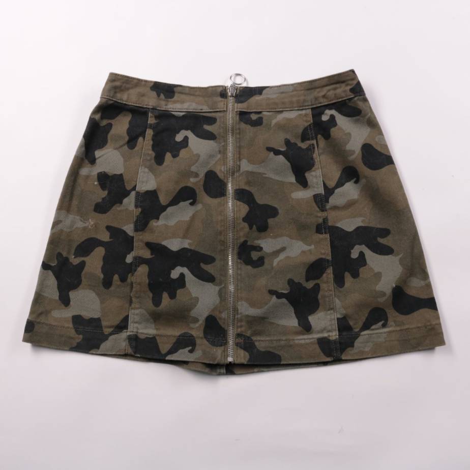 Юбка H&M короткой длины с камуфляжным принтом и застёжкой-молнией спереди. Подойдёт для повседневных образов с футболками, худи и кедами в тёплый сезон или с колготками в прохладную погоду. Плотный хлопок практичен в носке и хорошо держит форму.