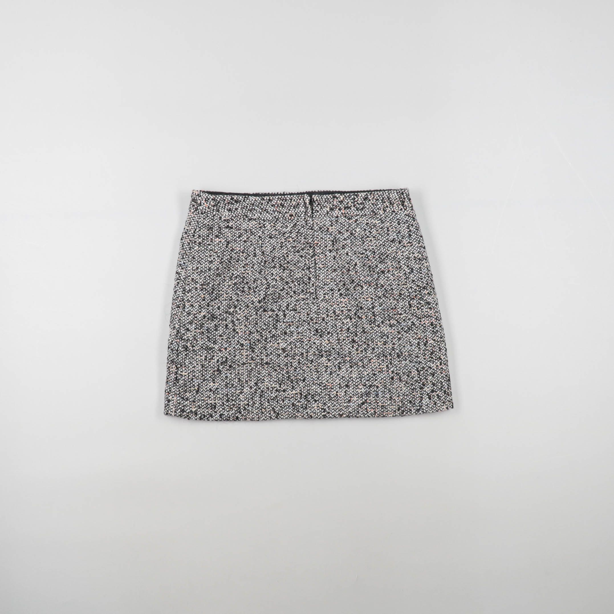 Женская короткая юбка из твидовой ткани меланж. Подойдёт для офиса и повседневных образов с водолазкой или рубашкой. Практичный плюс — немаркий серый цвет и плотный материал держит форму.