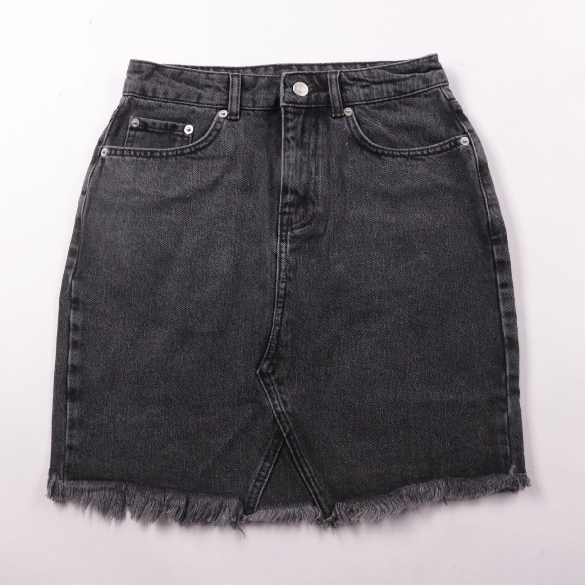 Джинсовая юбка NA-KD в вываренном чёрном цвете с необработанным (raw hem) краем и высокой посадкой. Подойдёт для повседневных образов с футболками, свитерами и обувью от кед до ботинок. Практичный плюс — плотная ткань и карманы, как у классических джинсов.